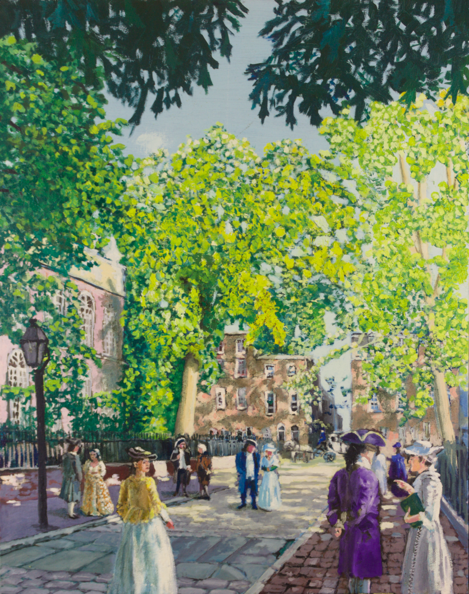 While the Revolutionary War rages, life goes on in Philadelphia on this sunny afternoon. Shops and taverns remain open, and people stroll along the streets. The couple in the foreground appear absorbed in a warm discussion: the poetry book in the woman’s hand hints at a romantic disposition, while the man’s upright, military posture suggests he may soon depart for the battlefield.
