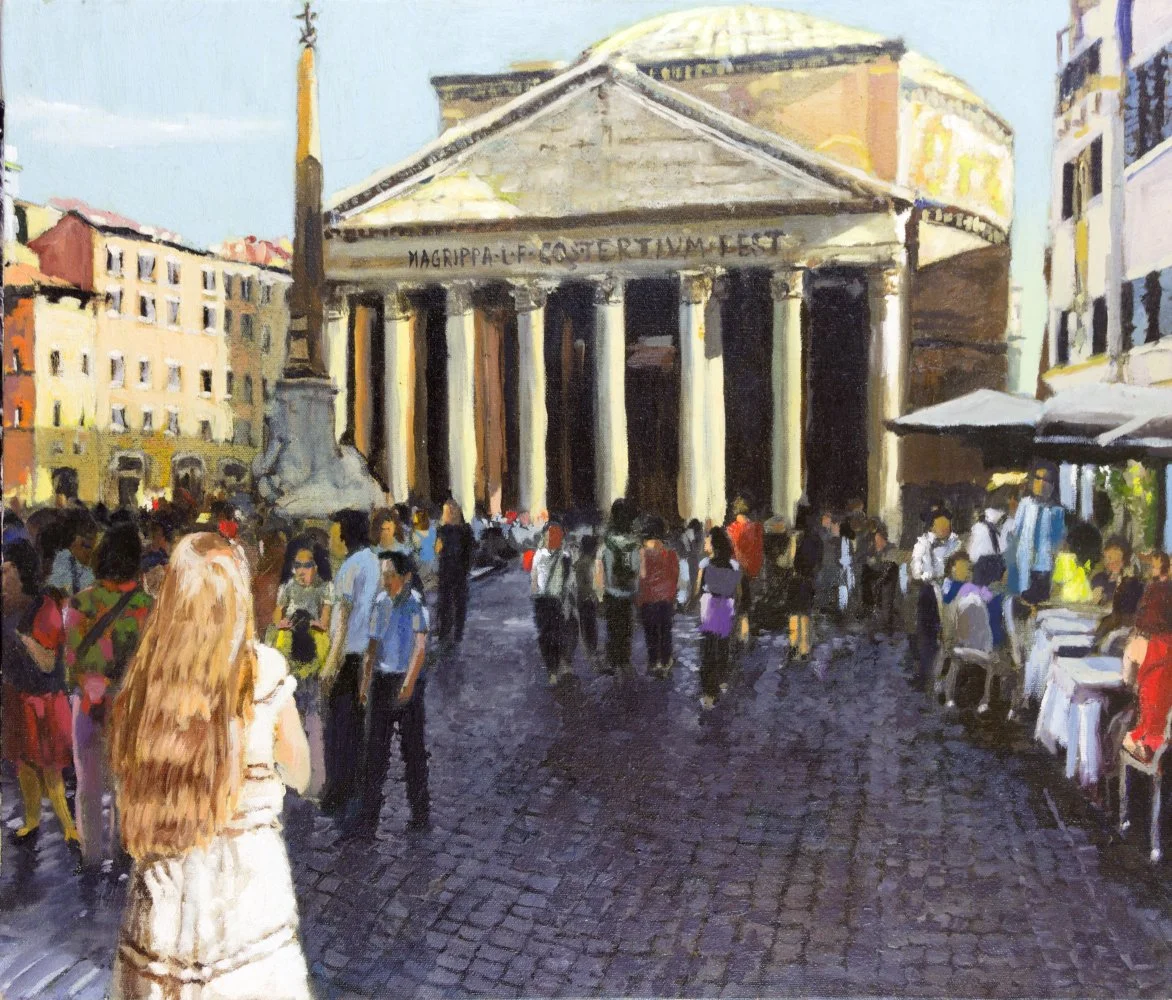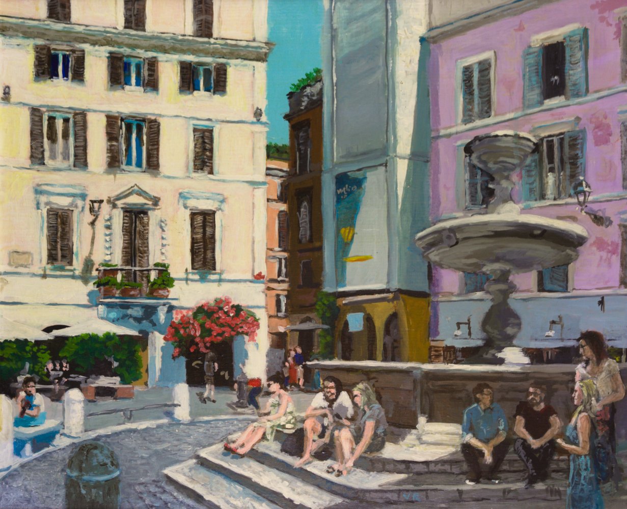 Exploring Rome for the first time is a unique experience. Getting your bearings - and that's what the tourist couple in the painting seem to be engaged in - is a joyful process. The church in the background is Santa Caterina a Magnanapoli, built in the 17th Century.