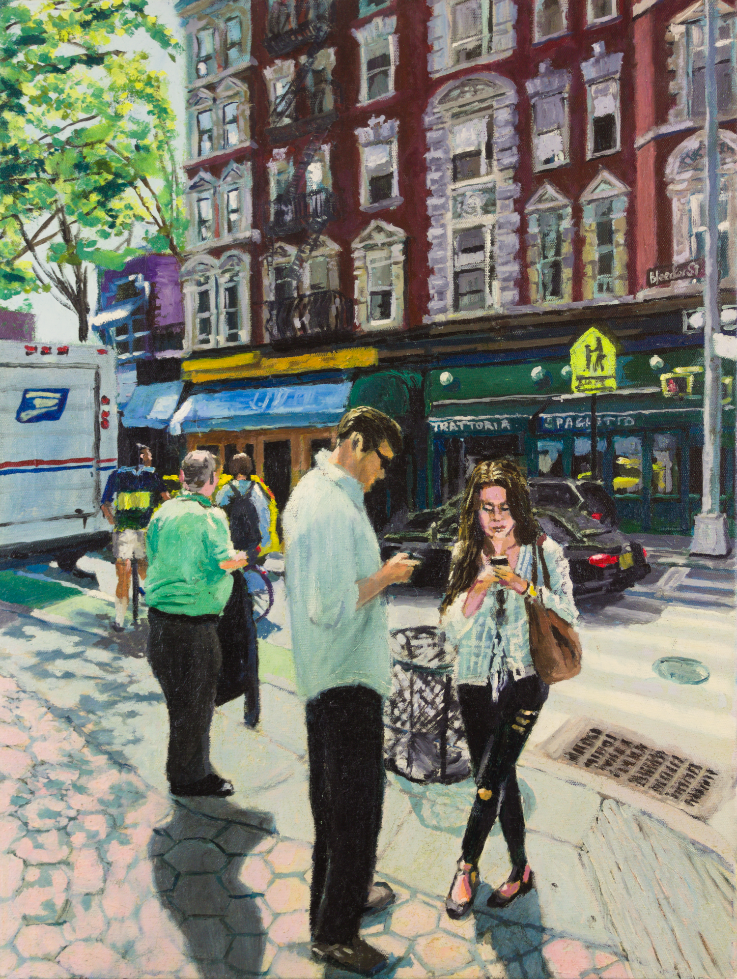 Because of its artistic reputation, it is often visited by tourists - and, occasionally, romantic couples looking forward to having a good time here. The couple in the painting are busy making some final calls before switching off their phones for the night.