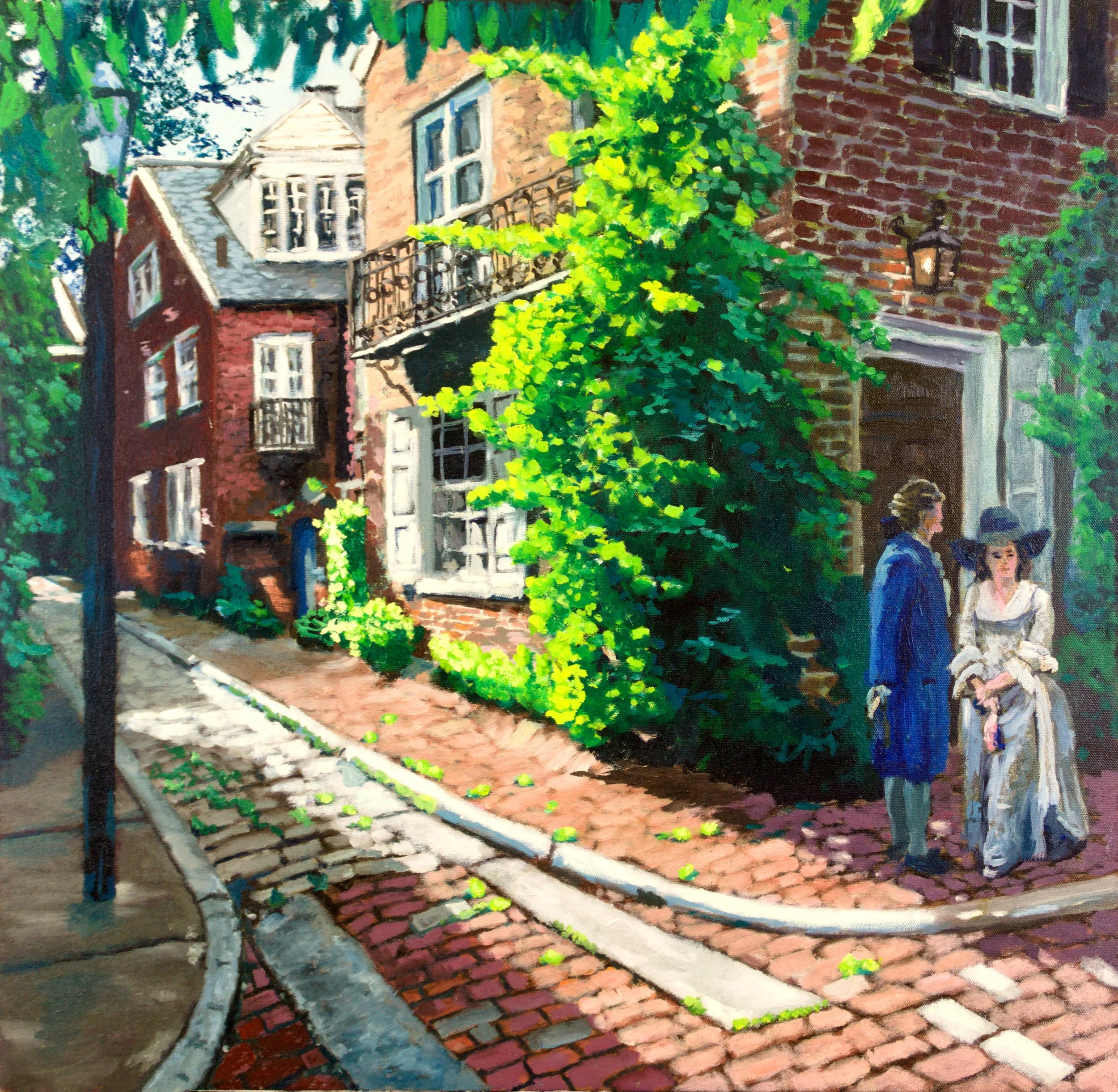 Just like in my other painting on this topic (Rendezvous in Philadelphia (in Public, 1776), the Revolutionary War is in full swing - but not here, in the residential neighborhood in the heart of the city. The couple are engaged in a tense discussion, attempting, one would imagine, to figure out where they stand with each other - while there’s still time: the man is likely to depart for the battlefield - soon.